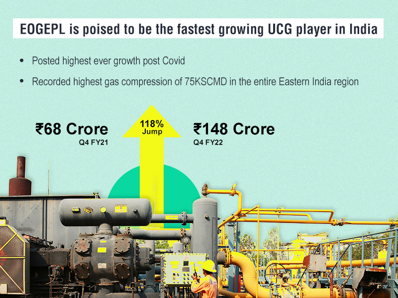 Mumbai/Durgapur, May 30, 2022: Essar Oil and Gas Exploration and Production Ltd (EOGEPL), India’s pioneering unconventional hydrocarbon (Coal Bed Methane) player, today reported 118% jump in its revenue YoY at Rs 148 crore in the fourth quarter ended March 31, 2022. The company had posted a revenue of Rs 68 crore for the same quarter previous fiscal. Core EBITDA grew by 32% QoQ to Rs 115 crore from Rs 87 crore in the same quarter previous fiscal. Sales volume grew by 42% YoY whereas sales price realization increased by 55% YoY and Gas production grew by 17% YoY at ~0.77 mmscmd.