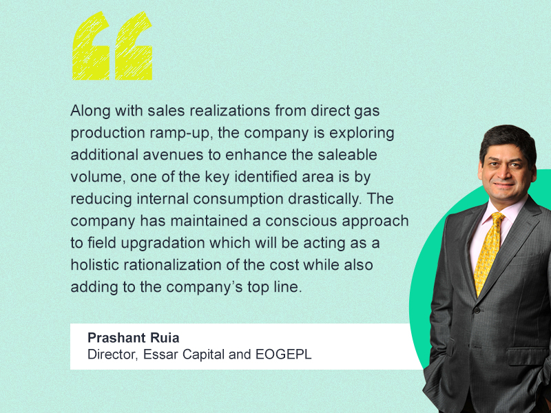 Commenting on the above, Mr Prashant Ruia, Director-Essar Capital and EOGEPL, said, “Along with sales realizations from direct gas production ramp-up, the company is exploring additional avenues to enhance the saleable volume. One of the key identified areas is to reduce internal consumption drastically. The company is maintaining a conscious approach to field upgradation which will be acting as a holistic rationalization of the cost while also adding to the company’s top line”