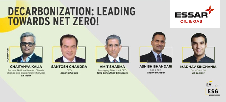The ‘ESG Leadership Dialogues’ webinar organised by EY India on November 16, 2021 included Mr. Santosh Chandra, CEO, Essar Oil & Gas Exploration and Production Limited (EOGEPL), as a part of an esteemed panel, discussing the topic ‘Decarbonisation: Leading towards Net Zero!’. The fellow dignitaries on the panel were Mr. Amit Sharma, MD & CEO, Tata Consulting Engineers, Mr. Ashish Bhandari, MD & CEO, Thermax and Mr. Madhav Singhania, Dy. MD & CEO, JK Cement.